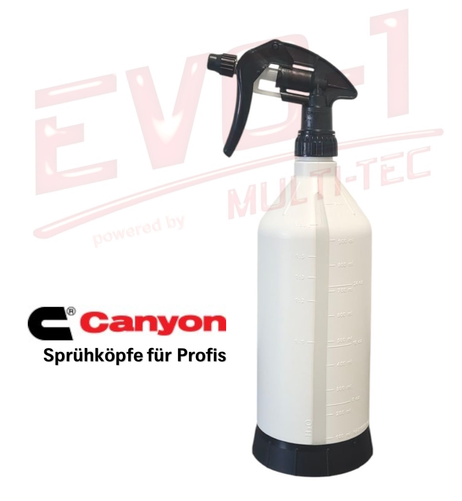 Die EVO-1 PRO DETAILING Sprühflasche mit seinen variablen Verdünnungskapazitäten und der flexiblen Auswahl an unterschiedlichen Sprühköpfen in Qualität, Anspruch, Design und Farben ist für nahezu alle Produkte und Anwendungen geeignet.